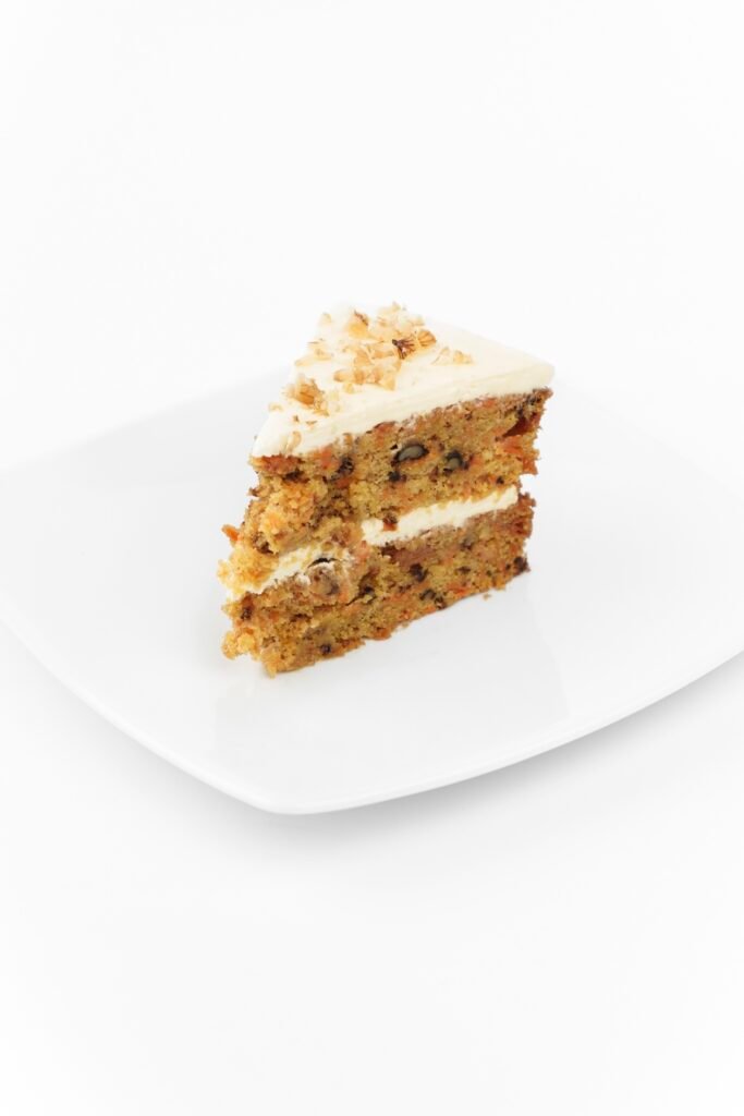 Suave y esponjoso queque de zanahoria con frutos secos, relleno de frosting de queso crema.