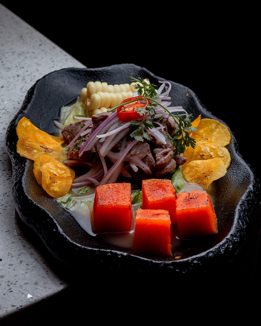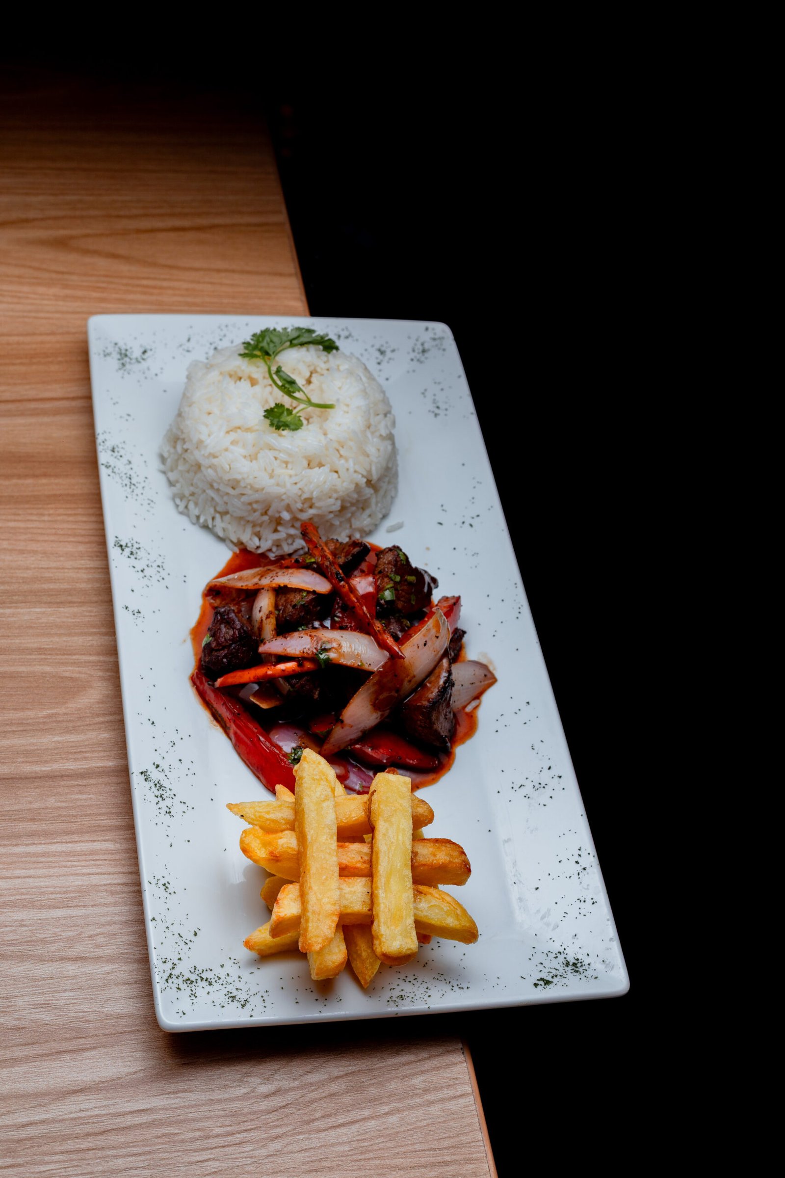 FETUCCINI A LA HUANCAINA CON LOMO SALTADO