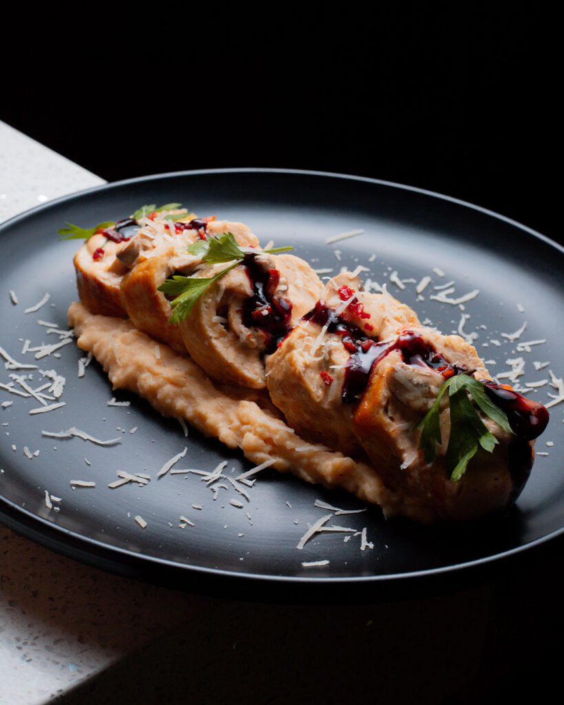 ROLLO DE POLLO CON TOCINO Y QUESO