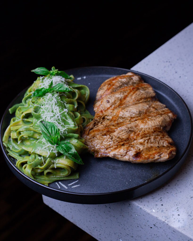FETUCCINI AL PESTO CON FILETE DE POLLO