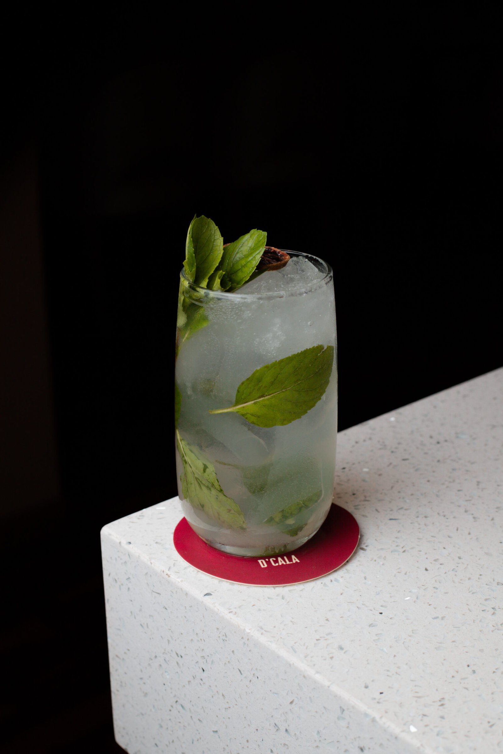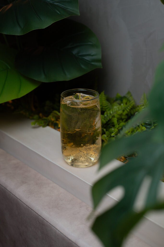 RON, ALBAHACA, HIERBA BUENA, TEXTURA DE PIÑA, FLOR MARIPOSA