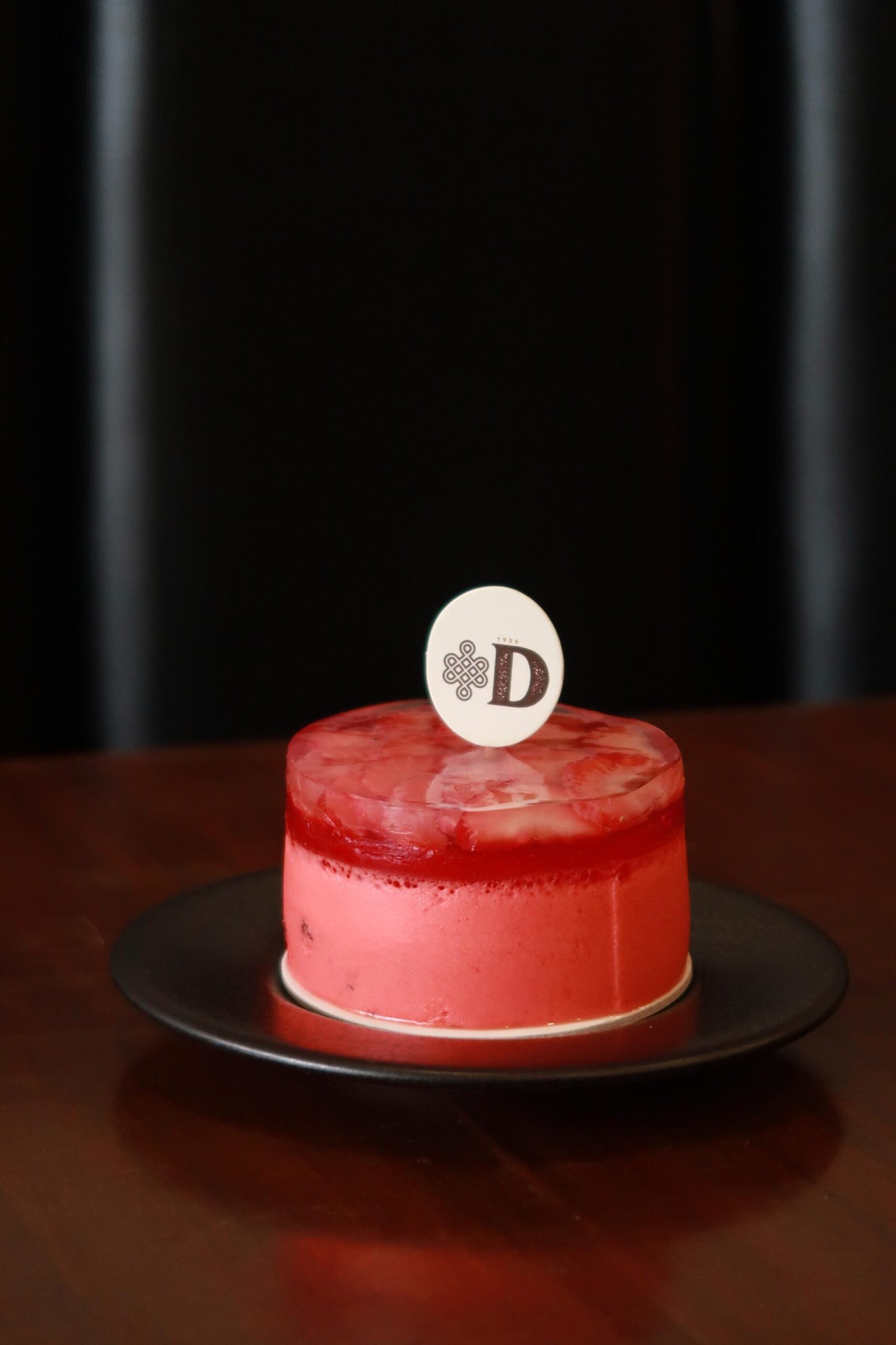 Mousse de Fresa relleno de bizcocho de chocolate y bizcochuelo de vainilla. Cubierto con gelatina de fresa, gelatina neutra y fresas laminadas encima.