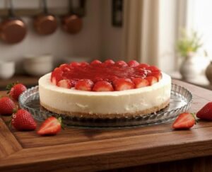 Pastel de queso cubierto con mermelada de fresa