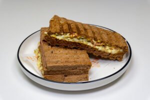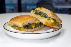 Delicioso sandwich relleno con huevo duro, harta palta, un toque de limón y sal; servido en pan ciabatta artesanal.