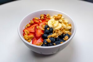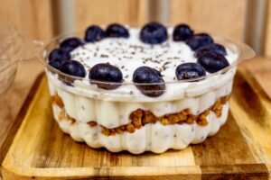 Minibowl de yogurt griego artesanal, semillas de Chía, granola crunchy, arándanos y chispas de chocolate oscuro.
