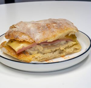 Preparado con jamón, laminas de queso y orégano; servido en pan ciabatta de masa madre al grill.