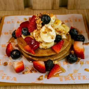 Panqueques de avena, leche sin lactosa y clara de huevo; acompañadas de frutas de estación y miel de abeja.