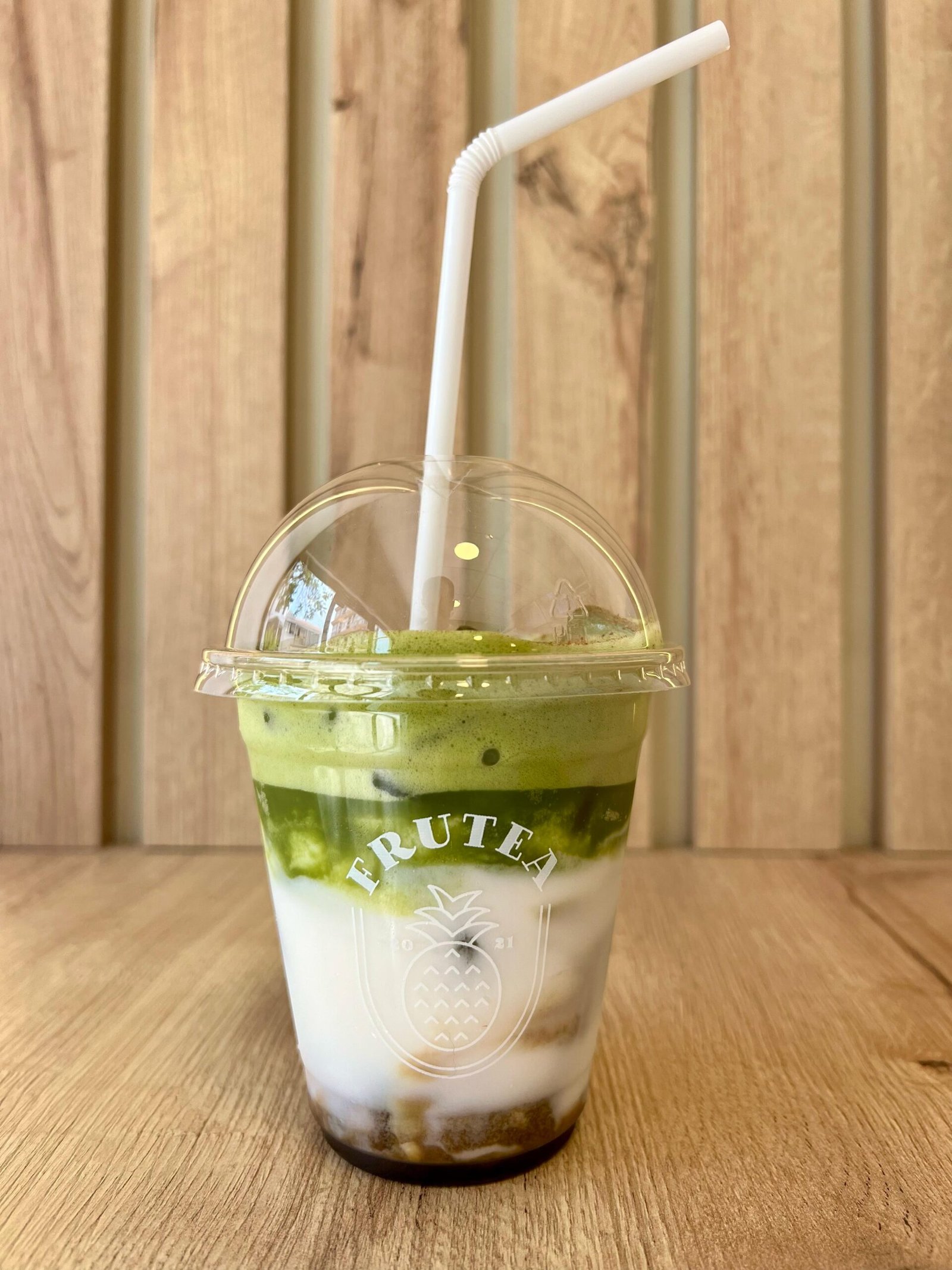 Matcha de grado ceremonial, vainilla, leche sin lactosa, canela en polvo, hielo y estevia.