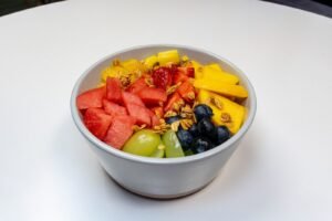 Uva italia, naranja, piña golden, fresa, sandía, arándanos, mango.