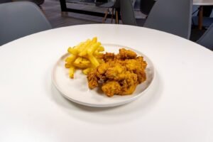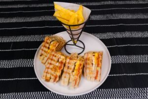 Clásico y abundante sándwich de triple pan tostado, relleno pollo, tocino crujiente, lechuga fresca, tomate, huevo y mayonesa. Servido con papas fritas.