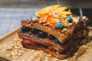 Rebanadas de pan integral empapados en leche sin lactosa, claras de huevo y canela en polvo; acompañadas de frutas de estación y miel de abeja.