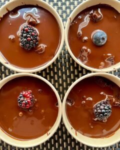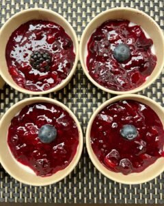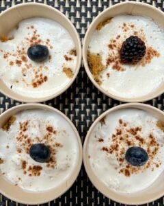 Preparado con una base de cacao, stevia, leche de coco y yogurt griego, bañado con mermelada de frutos rojos.