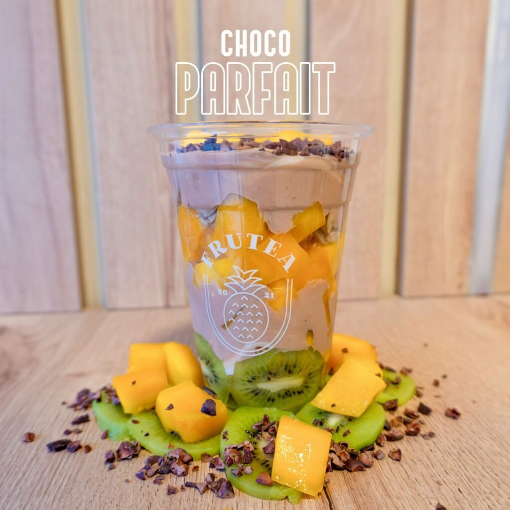 Parfait preparado a base de yogurt griego artesanal con fudge de cacao, plátano, fresa, arándano, semillas de girasol, granola crunchy y nibs de cacao al 100% o chispas de chocolate.
