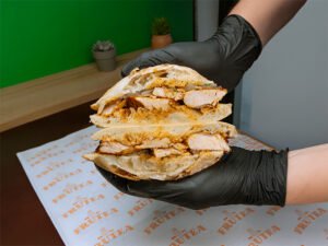 Pan ciabatta de masa madre servido con pollo deshilachado con trozos pequeños de apio, un toque de mayonesa y al grill.