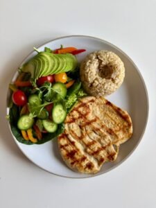 Filete de pollo al grill 200gr, arroz integral, ensalada fresca con cherrys de colores, espinaca bebé, arúgula orgánica, pepinillo bebé, pimientos y palta. acompañado de aliños de la casa.