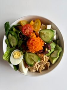 Pollo grilleado, mix de lechugas orgánicas, espinaca bebé, zanahoria rayada, cherrys de colores, palta, pepinillo bebé, huevo duro, tocino bites y queso fresco. Acompañada de aliños de la casa.