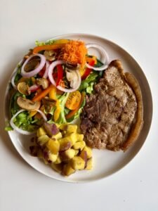 Chuleta de cerdo a las finas hierbas, acompañada de camote morado sancochado y una fresca ensalada de verduras como mix de lechugas, pimientos de colores, zanahoria rayada, champiñones y tomates cherrys de colores.