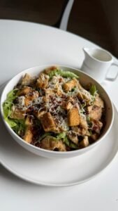 Clásica y deliciosa, elaborada con lechuga romana crujiente, pollo a la parrilla, crutones artesanales, queso parmesano recién rayado y tocino frito; acompañada de un aderezo césar casero, suave y sabroso.