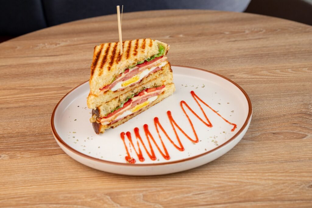 Pan Brioche de la casa, lechuga, tomate, jamón, tocino, huevo y queso.