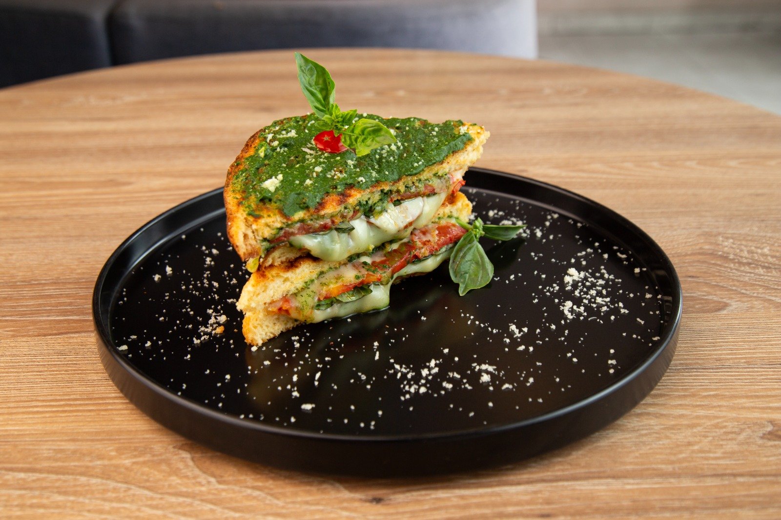 Sándwich Capresse: pan de la casa, pesto, queso mozzarella, tomate, albahaca. Café americano o Infusión de blend.
