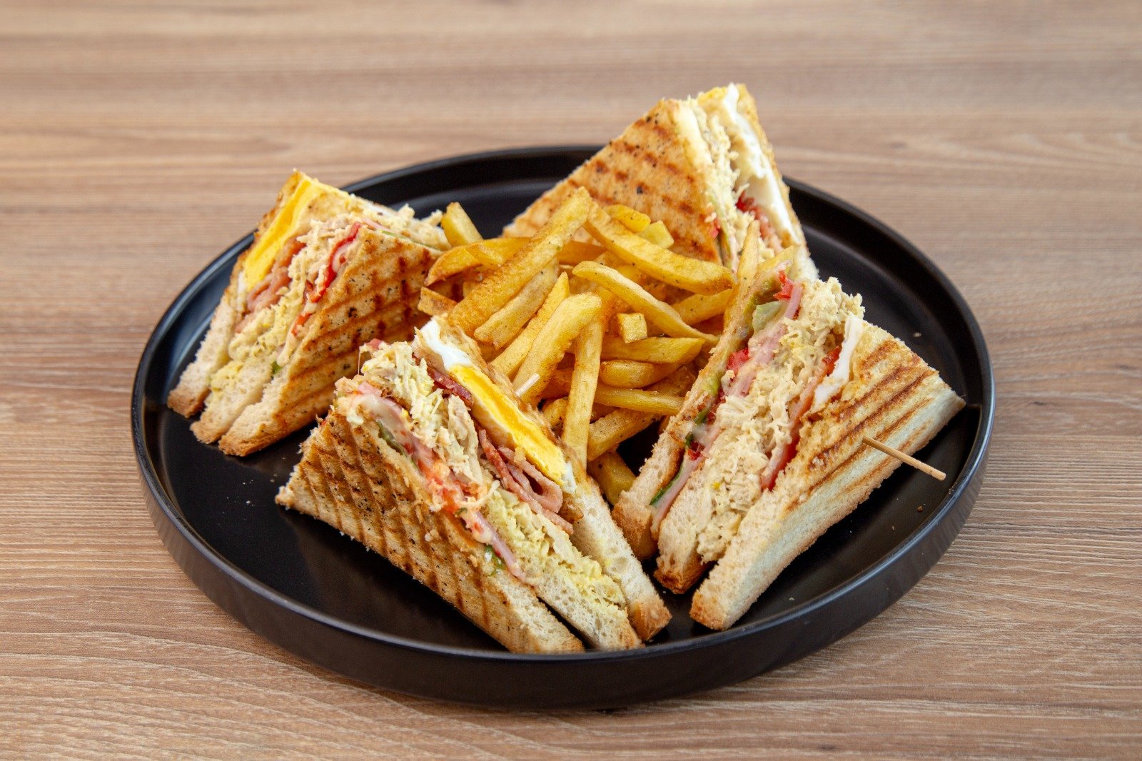 Pan molde, pollo, huevo, jamón, queso suizo, tocino, lechuga, tomate. Acompañado de papas fritas.