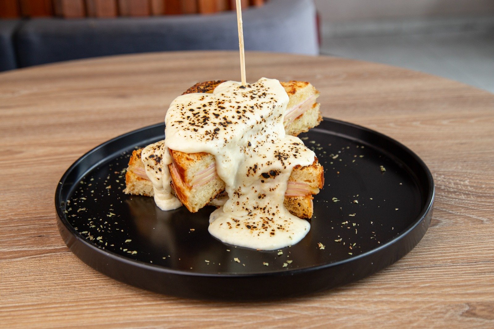 Pan Brioche de la casa, salsa bechamel, jamón cocido, queso suizo y queso mozzarella gratinado.