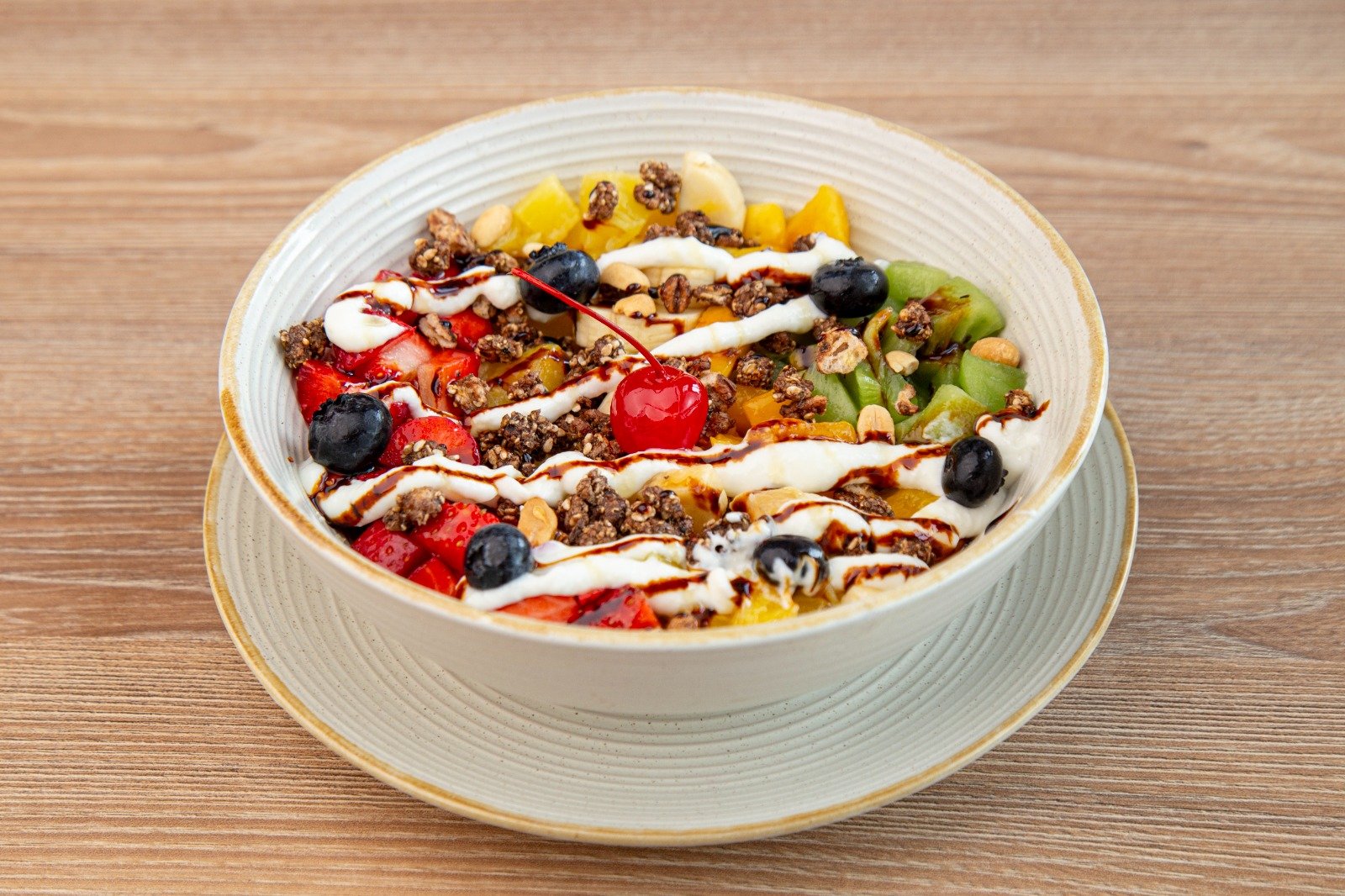 Bowl repleto con mix de frutas cortadas en pequeños trozos, servido con yogurt griego, granola, miel de abeja, y algarrobina.