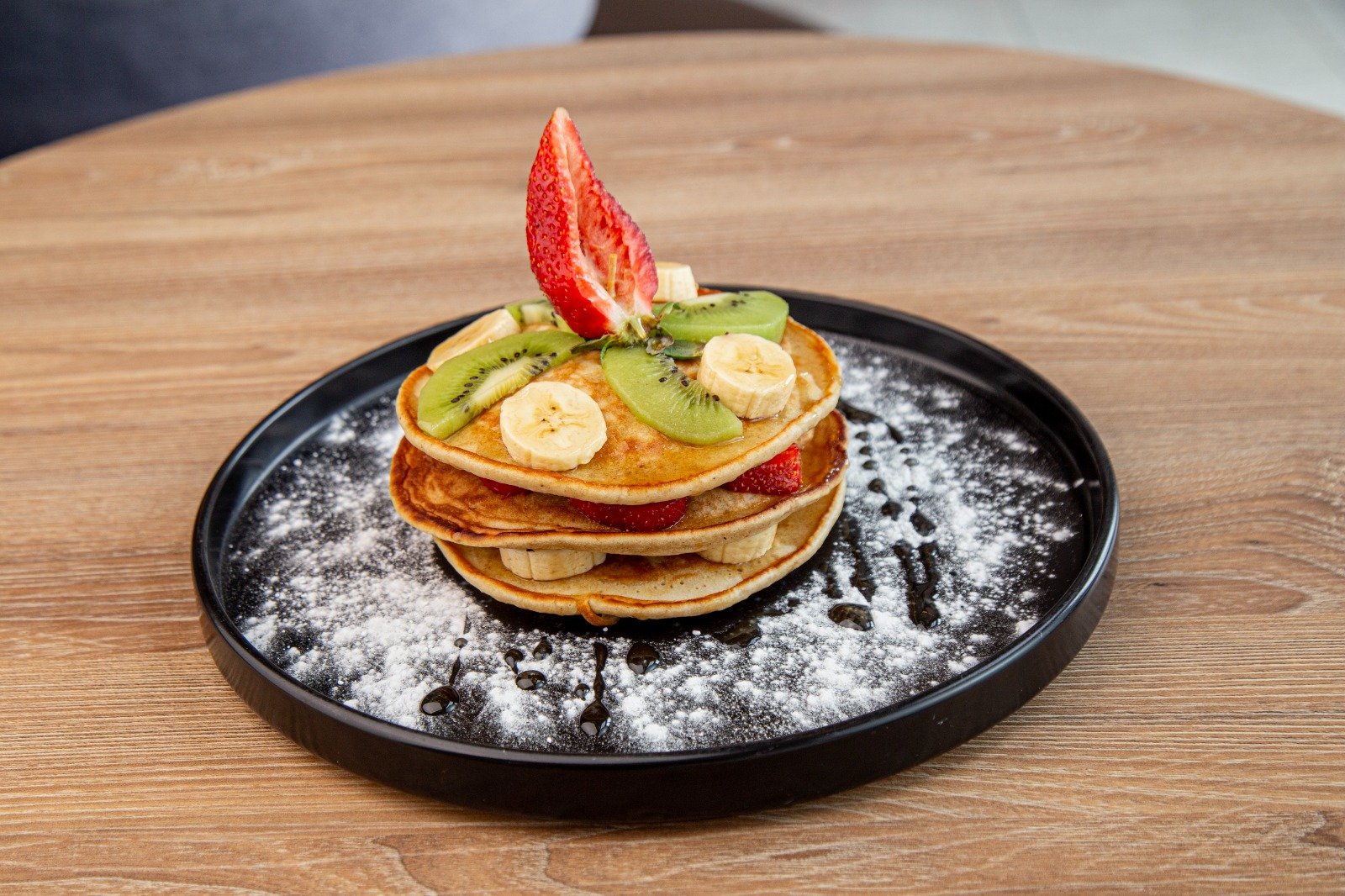 Hot cakes de avena servido con 3 frutas, miel de mapple, miel de abeja o chocolate. Jugo de naranja, jugo de fresa o chocolate especial.