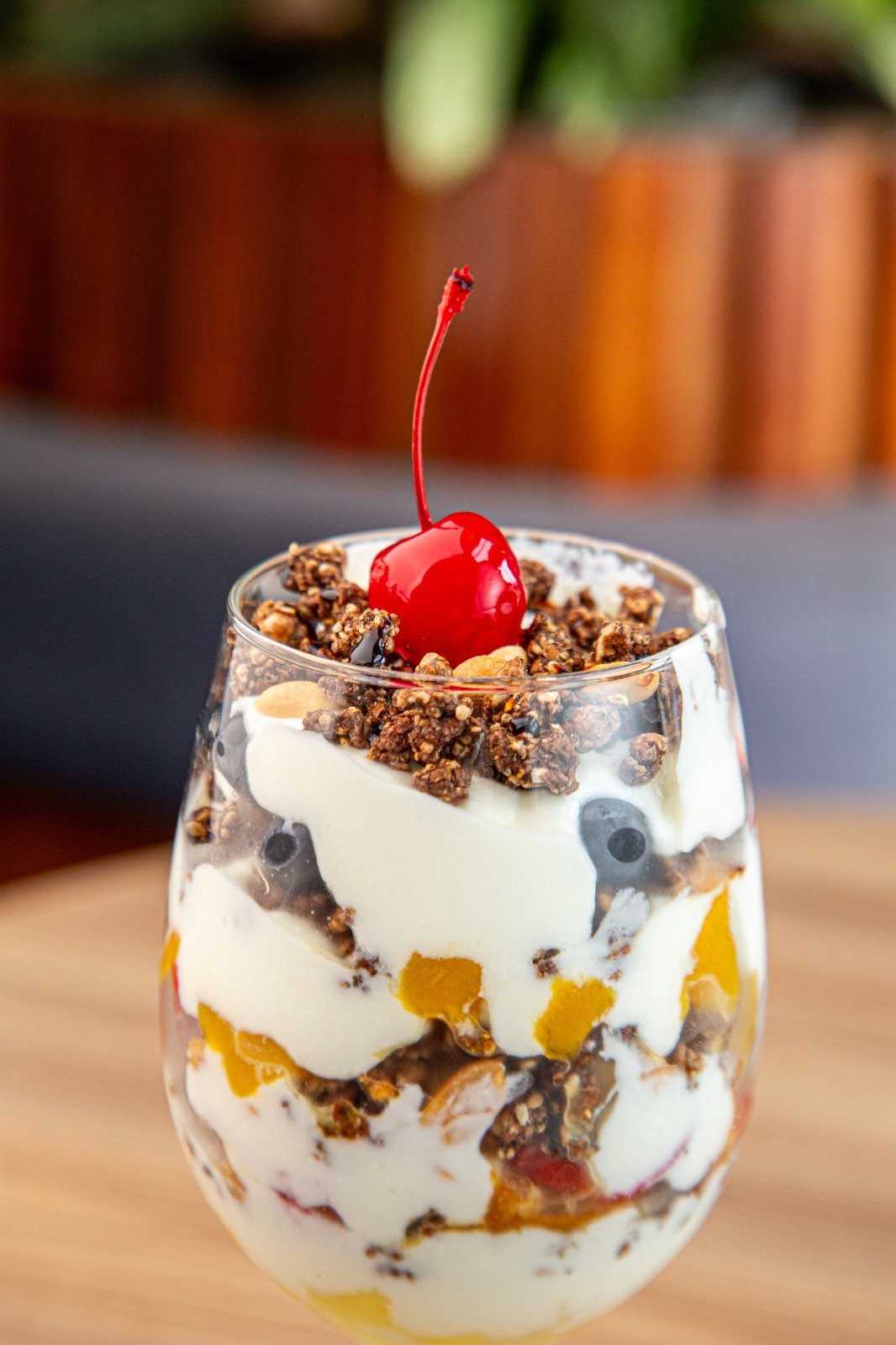 Deliciosa mezcla de frutas de estación, cortadas finamente, servido en un vaso elegante en capas con yogurt griego, granola, miel de abeja y algarrobina.
