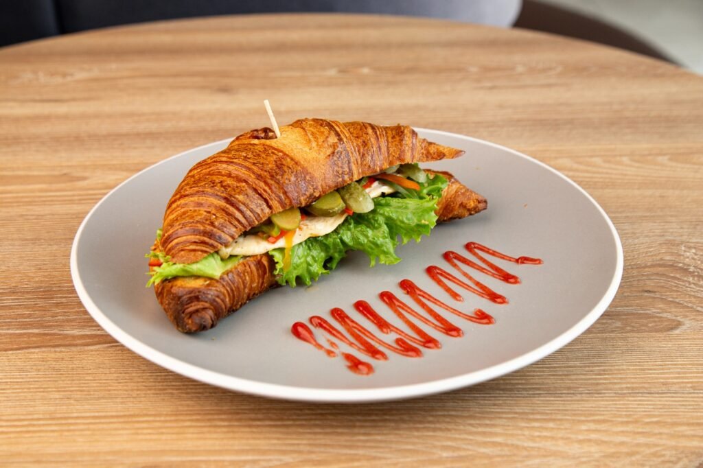 Pan croissant, filete de pollo, pimentón, cebolla caramelizada, tomate, lechuga y pepinillos encurtidos.