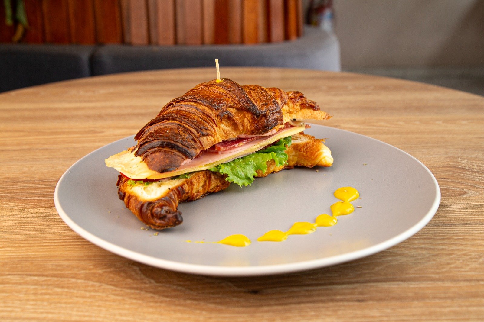 Pan croissant, salsa de tocino, lechuga, tomates, queso mozzarella, jamón y tocino.